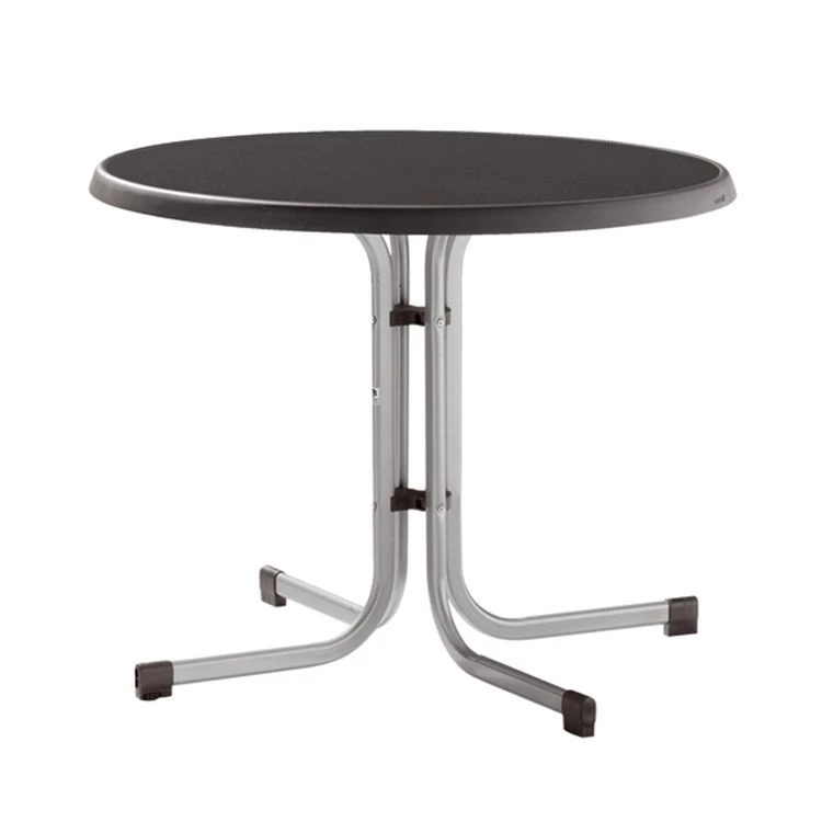 Dieser vielseitig einsetzbare Bistrotisch mit seinem klaren und attraktiven Design besteht aus einem polyesterbeschichteten Stahl-Rundrohr Gestell. Die hellgrauen, in Bodennähe abgerundeten Beine mit praktischen, schwarzen Puffern an den Enden sorgen für ausreichend Stabilität. Seine runde Tischplatte in Anthrazit ist aufgrund der thermoplastischen Kunststoffbeschichtung pflegeleicht, UV- und wetterfest.